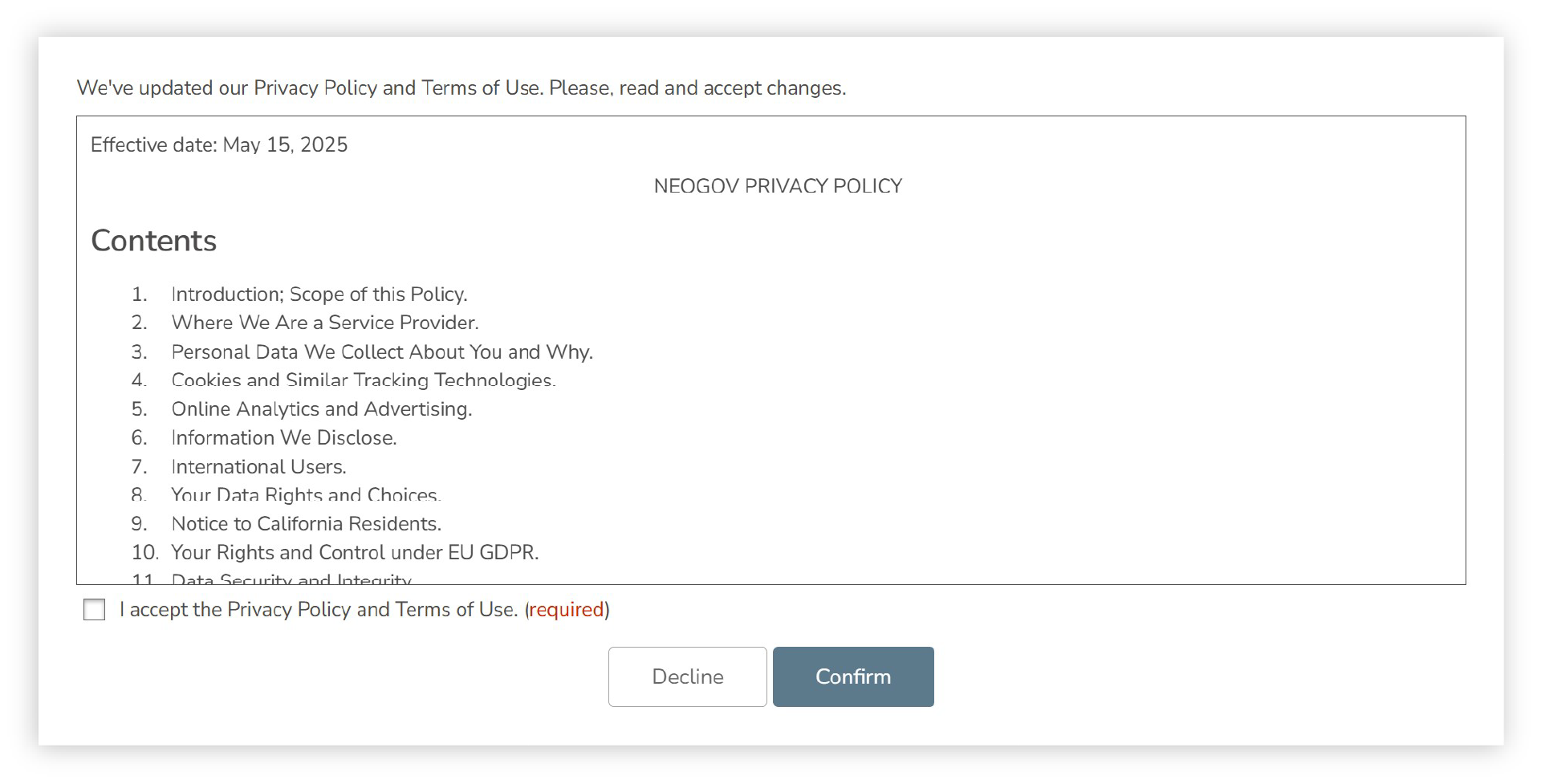 After verifying your email, log in and accept the Privacy Policy and Terms of Use to proceed.