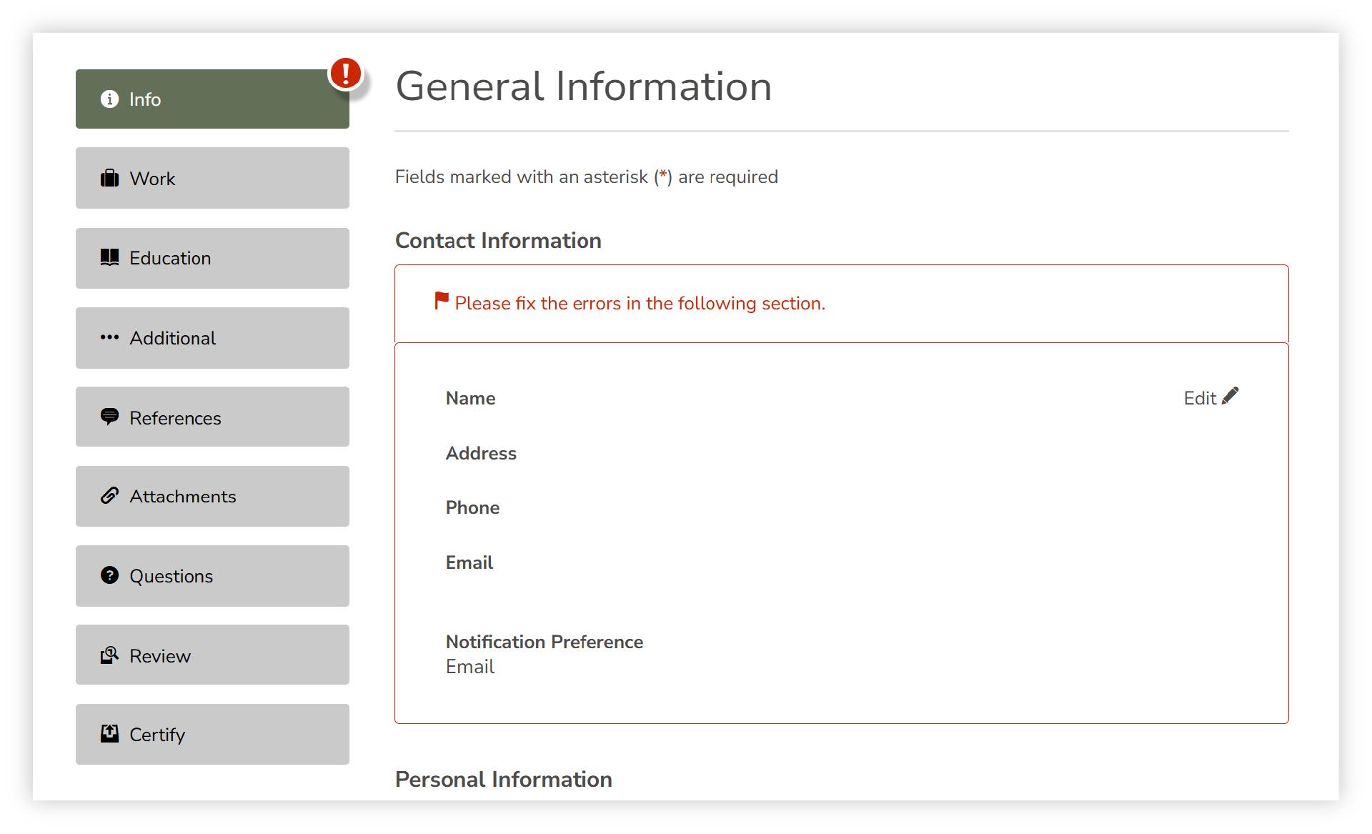 Note: Some sections may auto-fill from your resume. Double-check for accuracy and proper formatting.